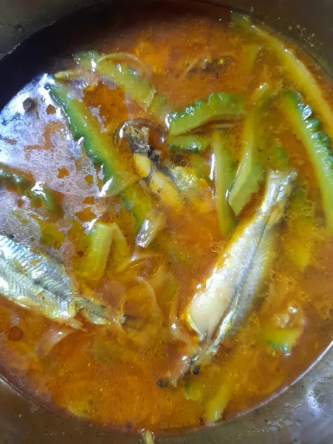 When the bitter gourd is cooked, add the fried tengra fish to the broth. Cook for another 5 minutes so that the flavors of the fish and bitter gourd blend together.